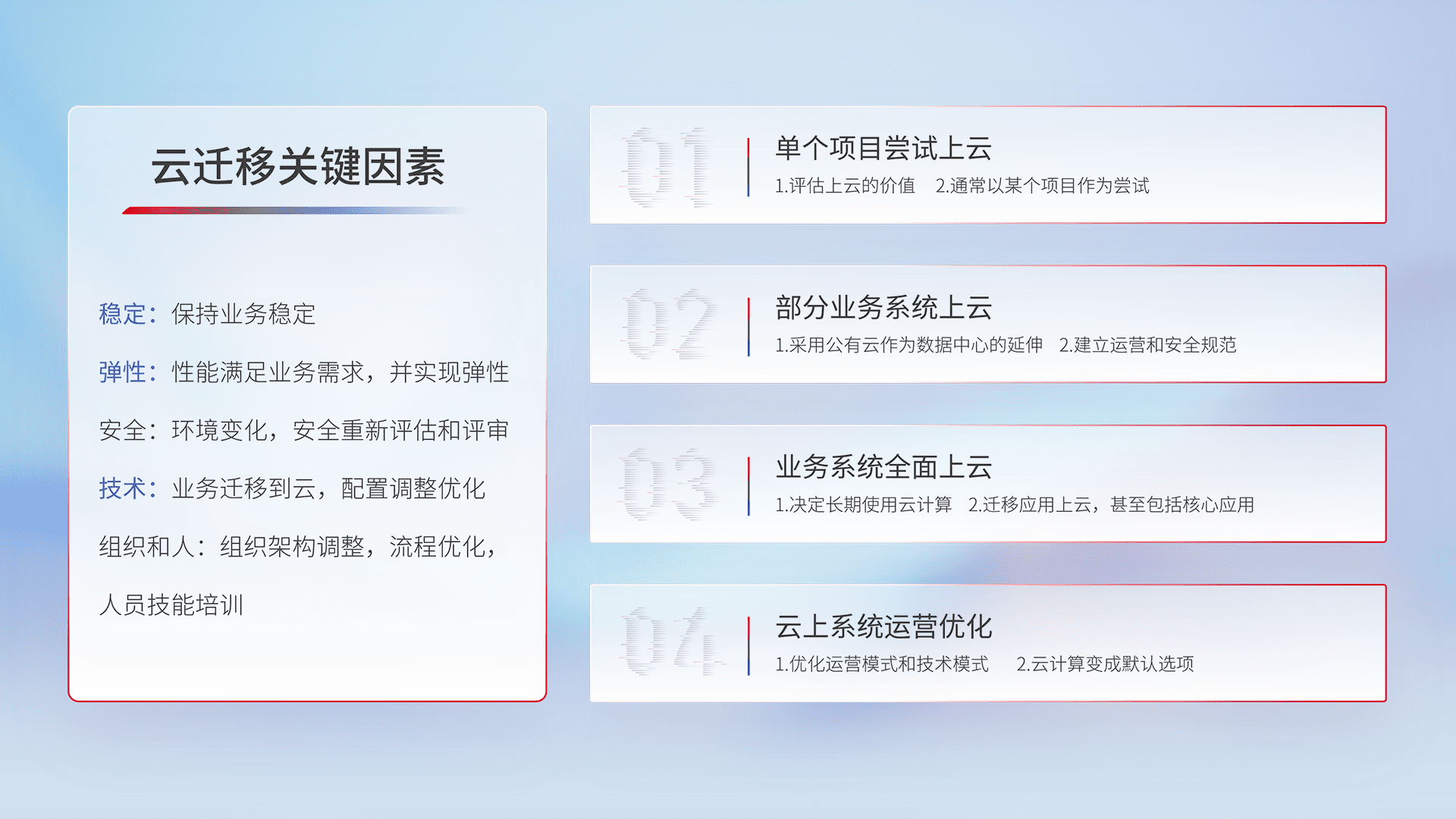 结合实际业务,,,,从规划设计、、、、云平台选型、、、云原生改造、、、数据迁移、、、集成交付,,,迁移全过程为客户识别最佳上云路径,,做好风险识别管理,,,,设计网络架构、、、身份权限、、、安全审计合规、、、、操作审计、、、、日志审计、、、监控告警策略、、多站点容灾设计等,,,对云上基础设施进行整体规划,,,,提升IT治理水平,,以满足弹性、、、高可用、、高性能的需求。。。