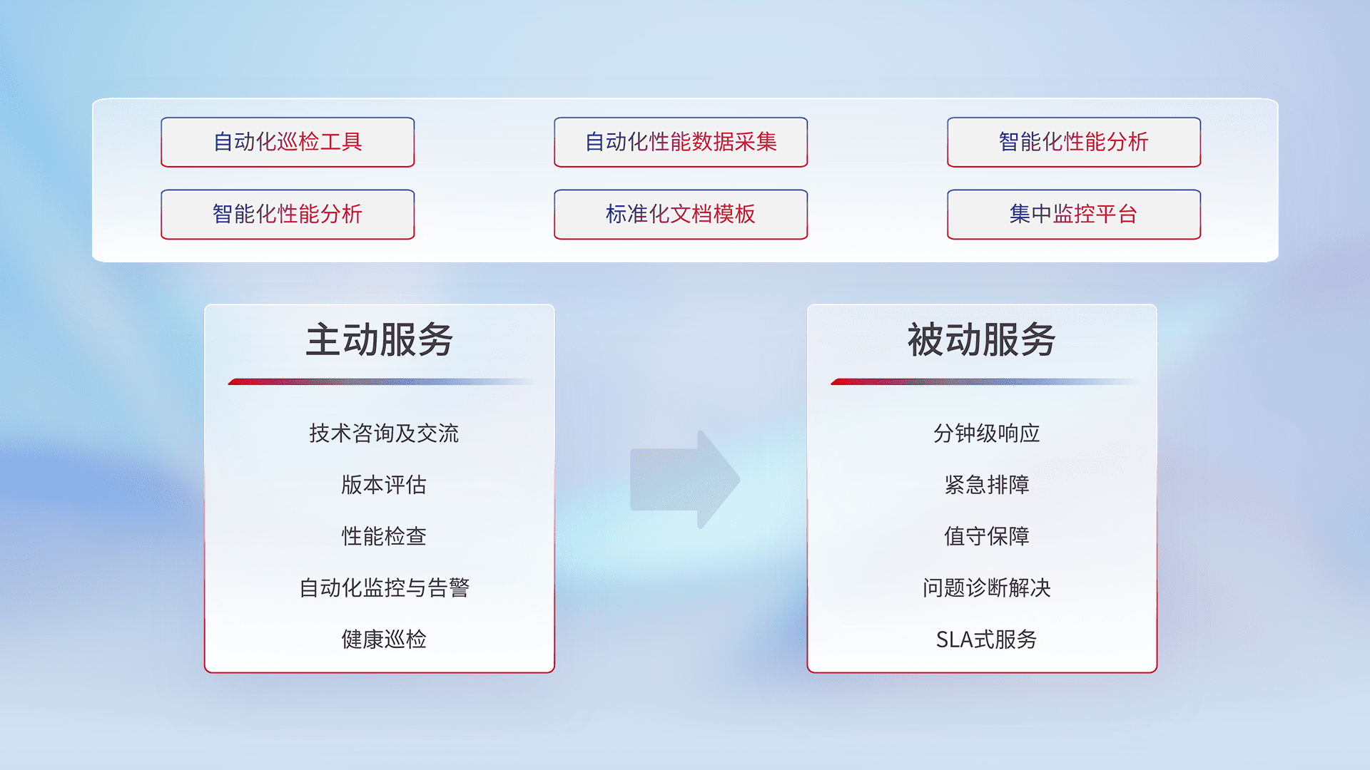 智能化工具和标准化文档,,,保障服务质量,,,,提供主动服务(包含技术咨询、、、、版本评估、、性能检查、、、、自动化监控与告警、、、健康巡检)和被动服务包含(分钟级响应、、、紧急排障、、、值守保障、、问题诊断解决、、、SLA服务)。。