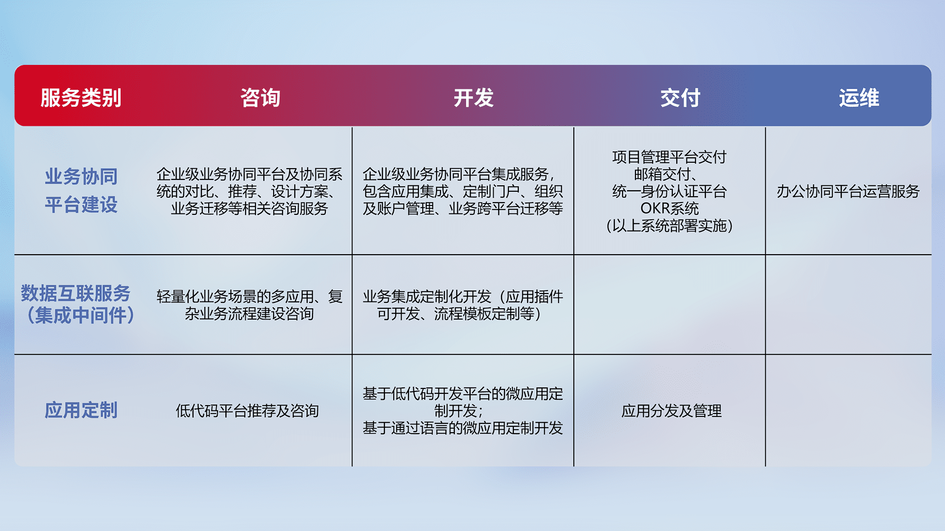 针对钉钉、、企微、、IDaas等平台级产品提供产品的规划、、方案、、交付、、定制化开发等服务,,,实现如统一协同办公、、、、智能客户服务、、混合会议管理、、、、智能数据查询、、、等业务场景,,实现数字化转型。。。